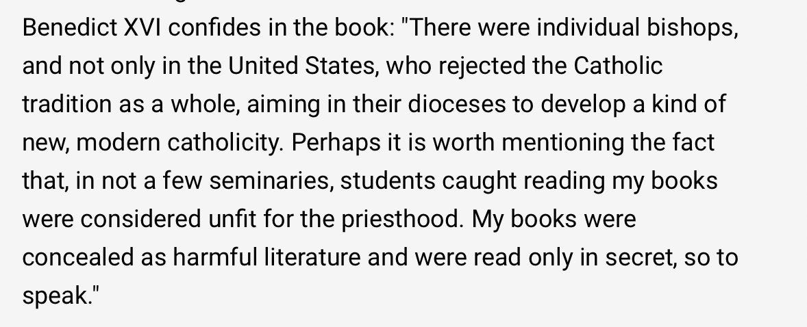 Benedictās writings and teachings had been barred from many Catholic seminaries because he was such and ardent steward of strong, traditional, orthodox religion. When your bishops and priests reject tradition, that should be a clear sign things are moving in the wrong direction. Obviously, with what follows, a VERY wrong direction.